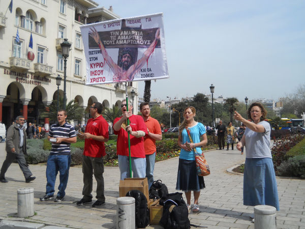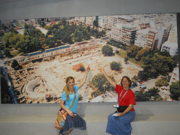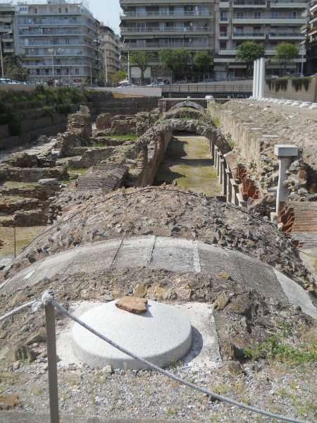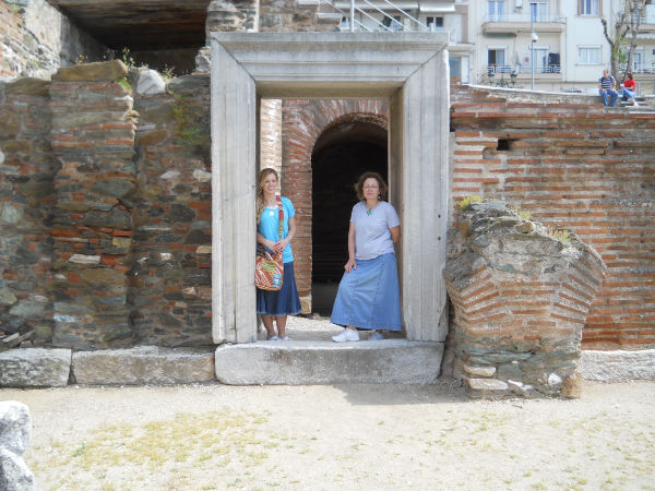 Got to the square and set up the scripture sign got our gospels of John and prayed. Then we sang some hymns and Br. Logan quoted some scripture. The man that started the riot a few weeks ago was there but he did not have the support that he did then. He was yelling, trying to show Ben and David an awful magazine and trying to get the crowd riled up (Reminded me so much of Matt. 27:20) but many of the men that were there were pushing him away and closing his magazine. Br. Logan told us to just ignore him and not give him the attention he was wanting and Praise God this man, full of the devil backed away and quieted down. Both teams went up and down the street, went by the bus stop to hand out the gospel with a little pretzel tasting on the side. Elisabeth was smiling and trying to converse with a young lady her age. The lady was trying to tell her something in Greek and in frustration she told Elisabeth in broken English, “just go to your home!” Elisabeth just continued to smile and hand out the gospel. Well by and by we handed out almost 1000 gospels of John, then once 2:00pm came we prayed and parted ways. The Logans went to have family time while Br. Angelo took the teams to eat. The restaurant had a co-op washroom which we ladies did not realize until we saw two doors with lady’s heads and two doors with men’s heads. Thankfully we were the only ones in there. After lunch we spent an hour handing out the rest of gospels (approx. 200) then headed to The Ancient Forum of Thessaloniki. At this time the temp. has risen to +21 and the sun is beating down. (We are all quite pink and a little tender.)