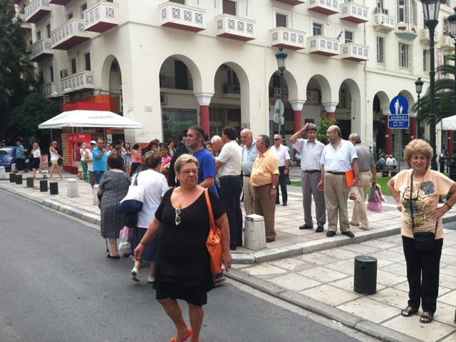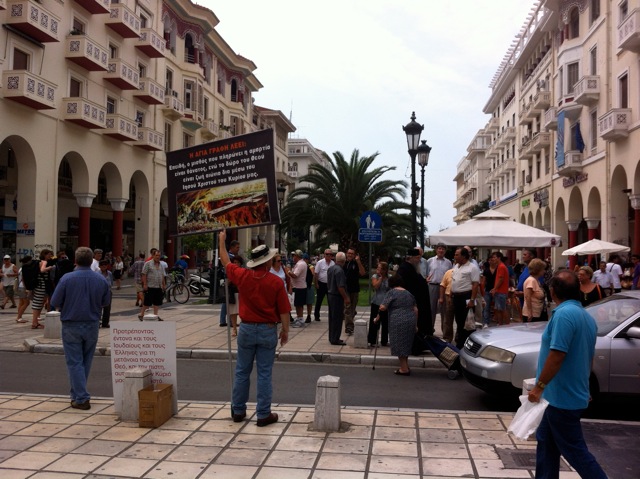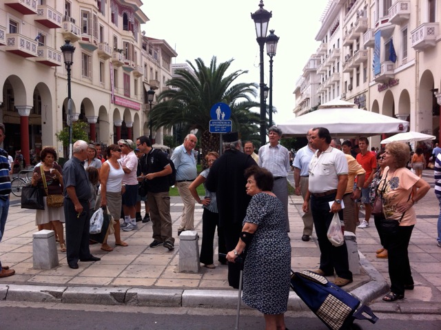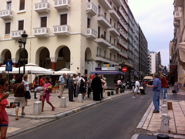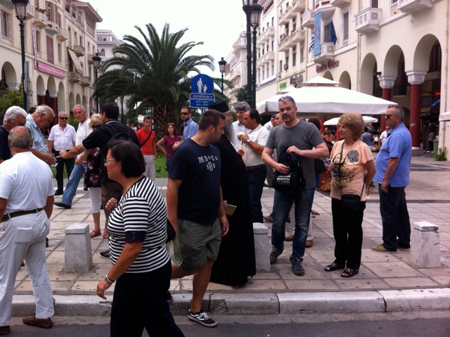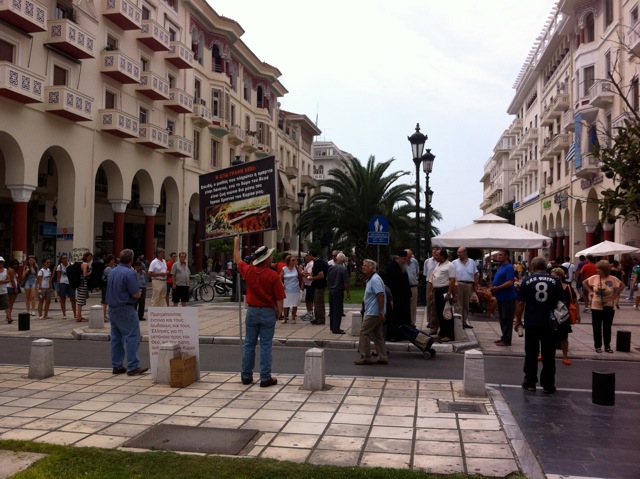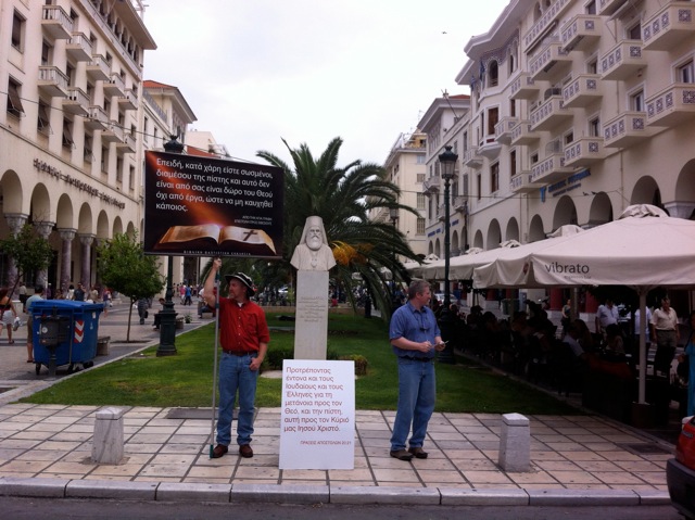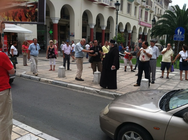 Angelo let the crowd know that there was only one mediator and that Jesus was the only Savior. “This priest can’t save you. He didn’t die for your sins. He can’t give you eternal life. He needs to be saved just like you.” Shouts rang out…”You can’t talk that way to a priest.” An unknown man shouts out, “They are speaking the truth. This priest is corrupt. He’s in it for the money.” The crowd grew bigger. Three fourths of the people were cursing us. A lady we vaguely remember from a month or so ago came through the crowd and grabbed Angelo’s hand, telling him to get out of there. “Don’t waste your time with the priest, just preach to the people.” Angelo began to preach in Greek. Bro. Logan was still preaching at the same time in English. Two messages going on at the same time pleading with about 40 captivated people to repent and believe the gospel. The scene was surreal.