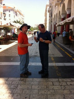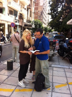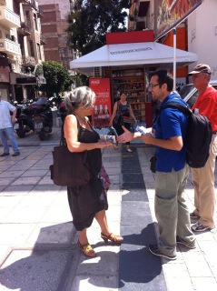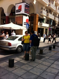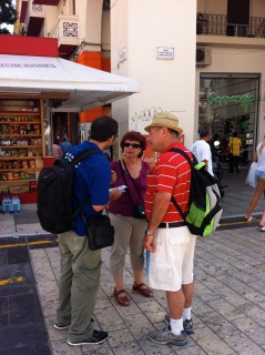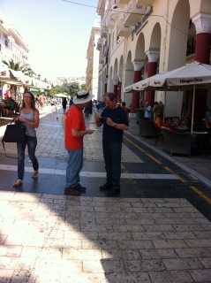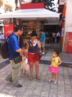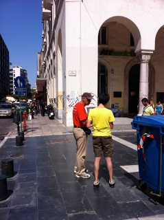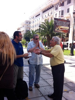 One man went nuts and interrupted Angelo’s gospel discussion with two ladies (picture below). He was screaming profusely. We tried to calm him down to no avail. He cursed us in Greek and then in English declaring the Orthodox church to be the only way of salvation. With the vile dirty words proceeding out of his mouth, Bro. Logan was able to separate him from Angelo so that the witnessing with the ladies could continue. The filthiest English words you have ever heard were hurled at Bro. Logan. He responded by asking whether or not he had learned these words from his wonderful all-saving church. “Is this how they teach you to speak?” Baffled and speechless, the man stopped his diatribe but made excuse for himself by saying that he wasn’t really a believer, but he knew he was still right. The Lord used the violent behavior of the man to stir others around the square. People began approaching us in curiosity over this event. DIscussion after discussion over the Bible continued. The Lord had turned something bad into a good opportunity.