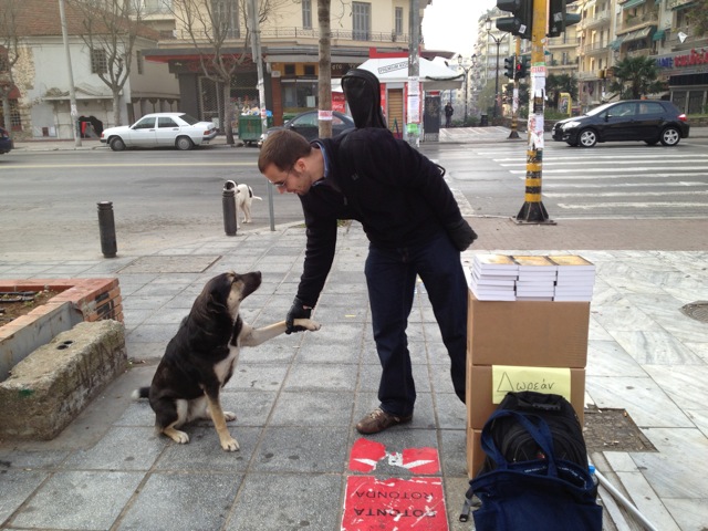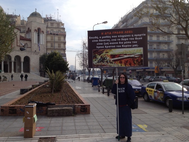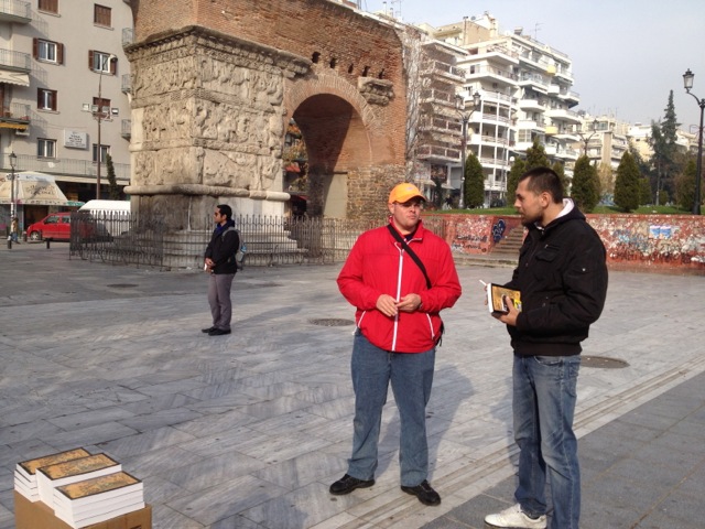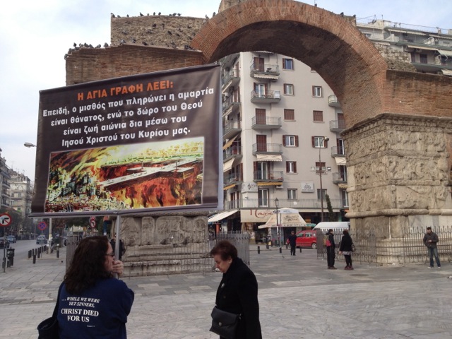 We weren’t sure what we’d find today when we made our way into Thessaloniki. Decided to camp out at the Roman arch with tracts, a banner, and a few boxes of New Testaments. (photos 077-078). (1) Not expecting nearly as much action at the platea. (2) Wanted to throw off our Orthodox friends from Monday. (3) Pretty cool to preach somewhere you expect the apostle Paul must have preached. (4) It’s close to the universities, and we thought this might give us a better chance at having conversations in English.