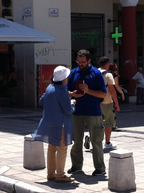 As the Logans sang Amazing Grace, a lady by the name of Andromachi (Picture 4) stopped. She said that she had never seen joy like these men had on their faces while they sang. As brother Angelo gave her the Gospel, she wanted so much to believe on the Jesus that we were proclaiming, and wanted nothing to do with G.O. church. Phone numbers were exchanged (she even went to the trouble of changing her mobile service provider to the same as Angelo’s to be able to talk on free time!!!) and she said she will try and come to church this Sunday. Please pray that God who is mighty to save will save their souls and deliver them from the bondage of religion.
