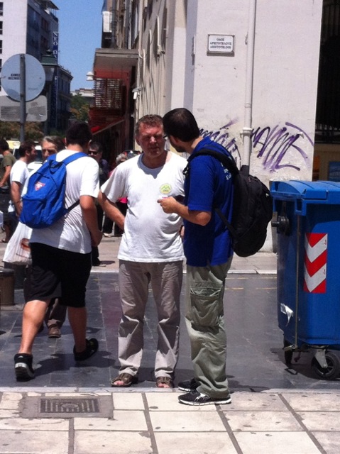 The Grandstaffs arrived safely in Thessaloniki with no baggage lost or even checked by the officials, so, praise the Lord, all the tracts came through with no problems. We went out Wednesday on the street to pass out tracts and do some publick preaching. Many people still believe we are Jehovah’s Witnesses. After Bro. Roger handed one lady a gospel tract, she was about to give it back and asked if we were Jehovah Witnesses. He told her “no Jehovah witness,” so she kept the tract. The same happened with Jacob. When he handed an elderly man a tract, the man looked at it and asked him if we were Jehovah’s Witnesses. A look of relief and satisfaction came over his face when Jacob emphatically told him we were not. Another lady asked Jacob who we are and he told her that we are Christians. “Orthodox Christians?” she asked. “No, just Christians,” he replied. It’s hard for the Orthodox to fathom the possibility of anyone being a Christian and not being Orthodox as well, since the Orthodox Church plays a vital role in salvation according to the doctrine that they are taught.