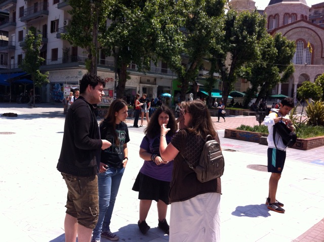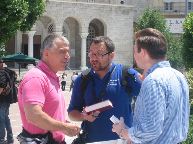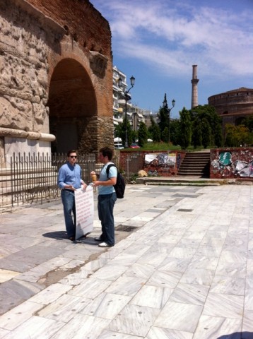 Brother Brent took us to the Galerius’ Arch, a small fishing pond a great place to witness. As the scripture signs were stationed in position the gospel tracts started to flow. Then brother Brent starts to preach the gospel and the conversations start. A crowd gathers and people start to ask questions. As I look around, everyone had groups of people all around them engaged in conversation. Some ridicule, others reject thinking we are JWs, but many for the first time hear about the true living God and his love and his simple plan of salvation for their souls. Mrs. Cindy has 4 Greek young people around her speaking in English (picture 1 below), Benjamin is witnessing to a young man from the USA that is G.O. (picture 2 below), Bro. Brent is contending with a man about the difference between believing the Bible and tradition (picture 3 below), while I have 2 young men with me engaged in conversation about Christ. ALL OF THIS IS GOING ON AT THE SAME TIME.