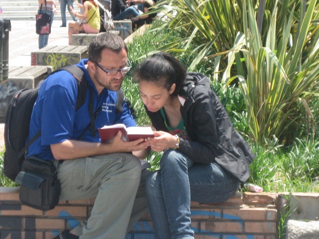 Bethany and Lydia come back to my back pack to reload gospel tracts as they pass out so many. Meanwhile, Brother Brent calls me over as he is witnessing to a young homeless lady who is addicted to drugs. As I start to share my testimony and show her the scriptures, she starts to read verse after verse (picture 5 below) as brother Brent distracts the drugged out boyfriend who was barely standing.
